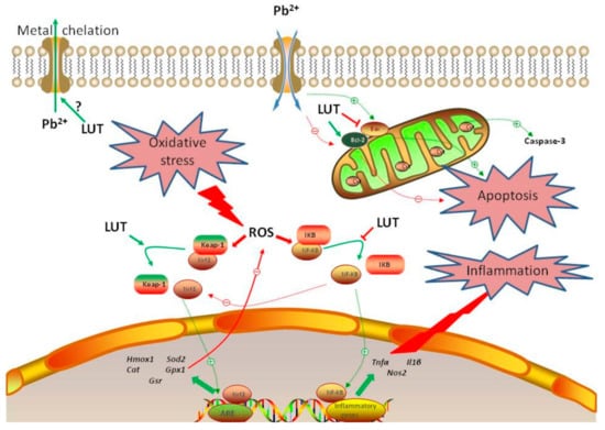 Summary suggesting the mechanisms of LUT attenuated hepatotoxicity induced by PbAc. Pb2+ enhanced ROS formation in cytoplasm inducing oxidative stress, finally led to apoptosis and inflammation. However, LUT promoted the Nrf2/ARE pathway and triggered the activation of NF-κB/cell death signaling pathways and prevented liver injury induced by Pb2+. Green line denotes stimulatory and red line denotes inhibitory effect.