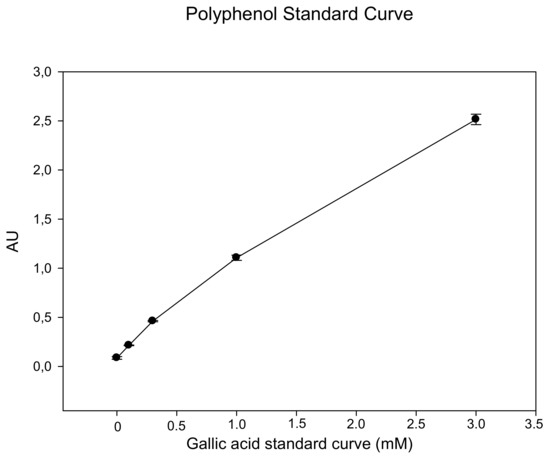 Gallic acid standard curve (mM). The range between 0.3 and 3 mM is linear. Samples with low polyphenol concentrations (<0.3 mM) should be applied undiluted.