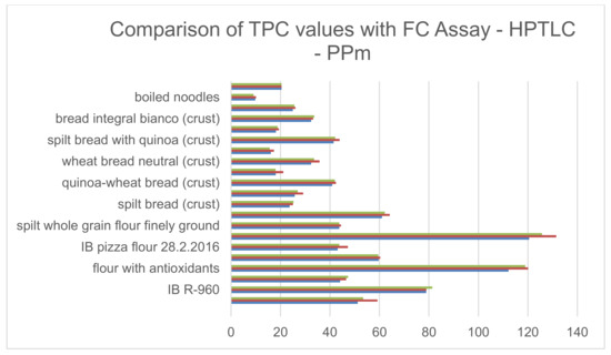 TPC was measured in diverse flours, breads (crumb and crust), and noodles, with three different methods, i.e., micromethod (PPm), classical FC assay, and HPTLC. These methods correlated significantly with a correlation coefficient of (r2 = 0.9829). For details, see Figure 2 [23].