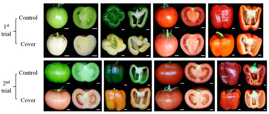 Tomato and pepper fruits under normal and cover conditions. Immature tomato and pepper fruit were covered with high-density polyethylene bags for 50–80 days and harvested on October 2017 (first trial) and March 2018 (second trial). Bar = 1 cm.