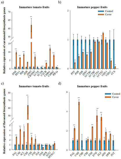 Relative expression of carotenoid and flavonoid biosynthetic genes in immature fruits under normal and cover conditions analyzed using qRT-PCR. The expression of carotenoid biosynthetic genes in immature tomato fruit (second trial) (a) and immature pepper fruit (first trial) (b). The expression of flavonoid biosynthetic genes in immature tomato fruit (second trial) (c) and immature pepper fruit (first trial) (d). The data represents the mean of at least three biological replicates and the error bars indicate the standard error (SE). The asterisk * and ** indicate a significant difference at p < 0.05 and p < 0.01, respectively, according to independent t-tests. DXS, deoxyxylulose 5-phosphate synthase; PSY1, phytoene synthase1; PDS, phytoene desaturase; ZDS, ζ-carotene desaturase; ZISO, ζ-carotene isomerase; CRTISO, carotene isomerase; LCYE, lycopene ε-cyclase; LCYB, lycopene β-cyclase; CYCB, chromoplast specific lycopene β-cyclase; CrtRb and CHY, β-carotene hydroxylase; PIF1a, phytochrome-interacting factor1; CCS, capsanthin-capsorubin synthase. PAL, phenylalanine ammonia lyase; C4H, cinnamate 4-hydroxylase; 4CL, 4-coumaroyl CoA ligase; CHS, chalcone synthase; CHI, CHALCONE ISOMERASE; F3H, flavanone 3-hydroxylase; F3′H, flavonoid-3′-hydroxylase; FLS, flavonol synthase; ANS, anthocyanidin synthase; DFR, dihydroflavonol-4-reductase; 3GT, flavonoid 3-O-glucosyltransferase; MYB12, SlR2R3-MYB.