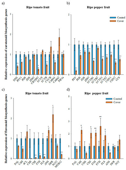 Relative expression of carotenoid and flavonoid biosynthetic genes in ripe fruits under normal and cover conditions analyzed using qRT-PCR. The expression of carotenoid biosynthetic genes in ripe tomato fruit (second trial) (a) and ripe pepper fruit (first trial) (b). The expression of flavonoid biosynthetic genes in ripe tomato fruit (second trial) (c) and ripe pepper fruit (first trial) (d). Data represents the mean of at least three biological replicates and the error bars indicate standard error (SE). The asterisk * and ** indicate a significant difference at p < 0.05 and p < 0.01, respectively, according to an independent t-test.