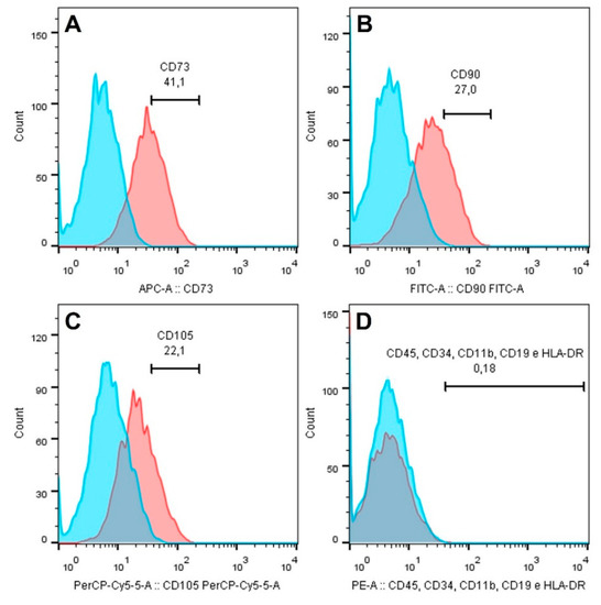 Expression of stem cell markers CD90 (A), CD73 (B), CD105 (C), and negative cocktail (D) in fibroblasts of periodontal ligament.