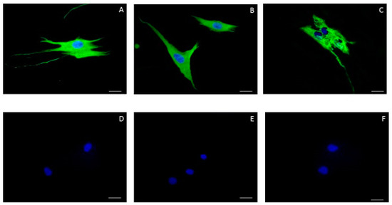Indirect immunofluorescence. Fibroblasts of periodontal ligament expressed vimentin (A) and fibronectin (B), but no cytokeratin AE1/AE3 (C). Negative controls were shown on (D–F). Nuclear staining was performed with Hoechst. Scale bar = 20 μm.