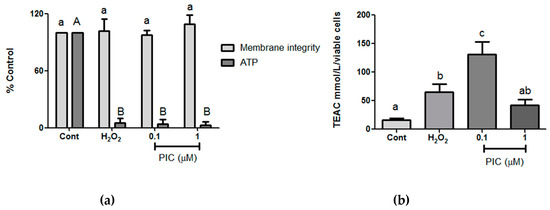 (a) Cell membrane integrity and ATP production and (b) total antioxidation capacity after 1-h treatment with hydrogen peroxide (H2O2) (200 µM) and different concentrations of piceatannol (Pic). The results are expressed as mean ± SD. Statistical differences between treatments at the same analysis were shown by lower case (a–c) and upper case (A–B) on graph (p ≤ 0.05).
