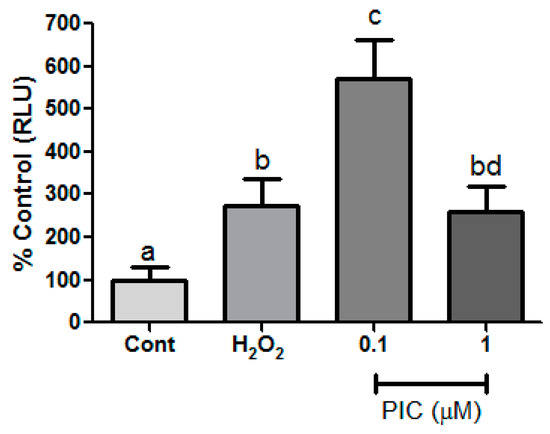 Reduced glutathione was measured after 1-h treatment with hydrogen peroxide (H2O2) (200 µM) and different concentrations of piceatannol (PIC). The results are expressed as mean ± SD. Statistical differences between treatments at the same analysis were shown by lower case (a–d) on graph (p ≤ 0.05).