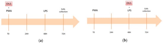 THP-1 cells were cultured in RPMI complete medium containing 2 mM L-glutamine, 10% fetal bovine serum (FBS) and 50 μM 2-mercaptethanol. The cells were maintained in a humidified atmosphere containing 5% CO2 at 37 °C in an incubator. A low-grade inflammation model was established as previously described by Park and collaborators []. Briefly, THP-1 cells were treated for 48 h with 5 ng/mL of Phorbol 12-myristate 13-acetate (PMA), which is the minimal concentration required to induce stable differentiation without undesirable gene upregulation. Then, cells were treated for 24 h with 20 ng/mL of lipopolysaccharide (LPS), as it has been demonstrated that macrophages differentiated at 5 ng/mL responded well to such a weak secondary stimuli []. This model was previously suggested as a suitable tool to study the inflammation-modulating effects of food-derived compounds []. Activated macrophages were exposed to the oils under two different experimental regimens: (a) pre-treatment with PMA for 72 h; and (b) co-treatment with LPS for 24 h (Figure 1). The oils were dissolved in DMSO.