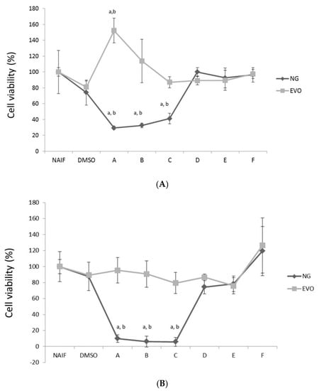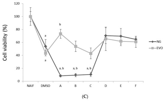 Cytotoxicity of the oils at different times, 24 h (A), 48 h (B), 72 h (C) and concentrations. The x axis shows the different concentrations of thymoquinone (A: 100 μM, B: 50 μM, C: 10 μM, D: 5 μM, E: 1 μM, F: 0.5 μM) contained in the Nigella sativa (NG) oil. Equivalent volumes of extra virgin olive (EVO) oil were tested with the same conditions. Statistically significant differences are indexed as follows: a = p < 0.01 vs. NAIF, b = p < 0.01 vs. DMSO.