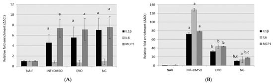 Gene expression of inflammatory genes after the treatment for the two experimental conditions: (A) SET1; (B) SET2. Statistically significant differences are indexed as follows: a = vs. NAIF; b = vs. INF + DMSO; c = vs. EVO.