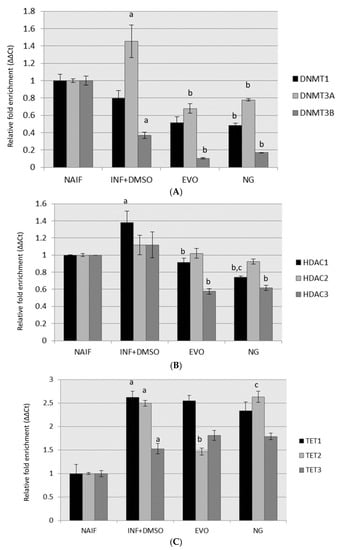 Gene expression assessment after the treatments in experimental setting 2 (SET2) for (A) genes regulating DNA methylation; (B) genes regulating histone acetylation; (C) genes associated with DNA demethylation. Statistically significant differences are indexed as follows: a = vs. NAIF; b = vs. INF + DMSO; c = vs. EVO.