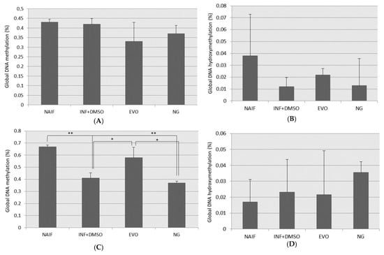 Global DNA methylation and hydroxymethylation levels measured under the different conditions for the two experimental settings: (A) DNA methylation for SET1; (B) DNA hydroxymethylation for SET1; (C) DNA methylation for SET2; (D) DNA hydroxymethylation for SET2; *: p < 0.05; **: p < 0.01.