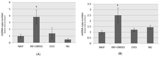 MtDNA copy number assessment after treatment under the two experimental conditions: (A) SET1; (B) SET2. a: p < 0.05.