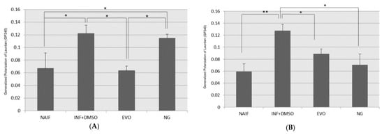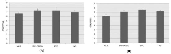 GSH plays a key role in redox control at the level of the cytosol and mitochondria; GSH works non-enzymatically with several kinds of oxidants, and its concentration decreases during acute inflammation with the formation of GSSG. In the present study, no significant alterations in the GSH/GSSG ratio could be measured under these experimental conditions among all the different treatments (Figure 7A,B).