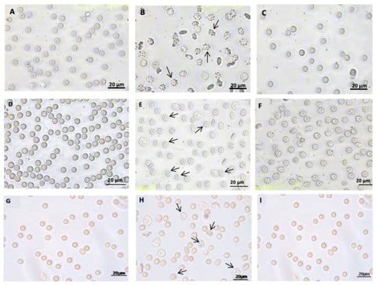 Light microscope observations of untreated human red blood cells [8,34,37,40,41] (A,D,G), or exposed to either pH 6.5 SO4= medium (B) or to pH 6.5 SO4= medium plus 10 μM curcumin [34] (C); human erythrocytes exposed to either 300 μM H2O2 (E), or exposed to 10–300 μM H2O2 (pre-conditioning) [37] (F) in SO4= medium incubation; human erythrocytes exposed to either 300 µM H2O2 (H), or exposed to 100 Melatonin plus 300 µM H2O2 [40] (I) in SO4= medium incubation. 400× magnification. Arrows indicate erythrocytes morphological alterations. Red blood cells shape is irregular due to spines, if compared to the untreated erythrocytes. Pictures are modified from references cited above.