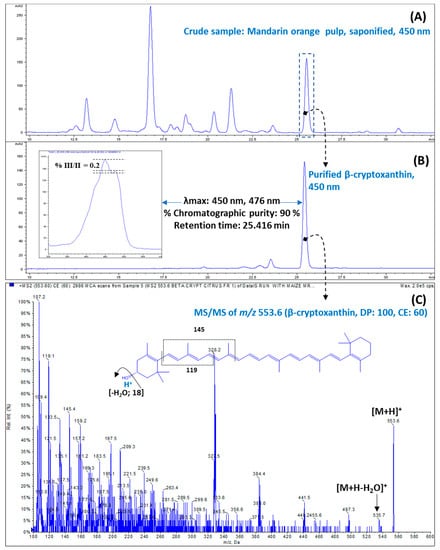 Isolation and characterization of β-cryptoxanthin. The high-performance liquid chromatography (HPLC) chromatogram of (A) a crude sample, and (B) isolated β-cryptoxanthin, showing λmax and spectral fine structure. (C) The fragmentation pattern (tandem mass spectrometry (MS2) of m/z 553.6) of the β-cryptoxanthin molecule recorded using atmospheric-pressure chemical ionization (APCI)+ mode.