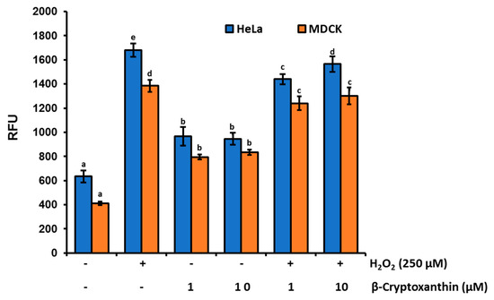 The effect of β-cryptoxanthin treatments on cellular ROS productions and accumulations. The enhanced levels of cellular ROS in both normal MDCK and HeLa cells were triggered by treatments with 250 µM H2O2, followed by treatment with β-cryptoxanthin (1.0 and 10 μM) for 24 h. Relative fluorescence of ROS was assessed by a microplate spectrofluorometer. All data are reported as mean values ± SD from independent experiments (n = 3). The means accompanied by different alphabets (e.g., a, b, c, d, and e) are significantly different at p < 0.05.