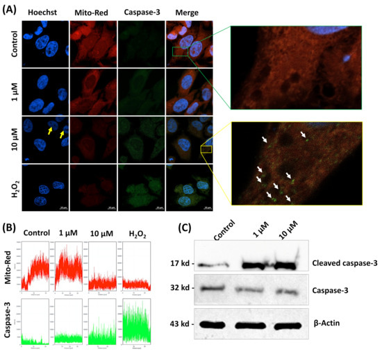 (A) Confocal observation of native caspase-3 protein expression (immunofluorescence assay), the integrity of the mitochondrial membrane, and Hoechst 33258 observations of apoptotic nuclei. In Hoechst 33258 stained HeLa cells, the yellow arrow indicates the apoptotic nuclei. Weak nuclear staining in β-cryptoxanthin (10 µM) treated cells probably caused by condensation and fragmentation of the DNA. The white arrows indicate the enhanced expression of native caspase-3 proteins. (B) The red and green fluorescent intensity show the integrity of the mitochondrial membrane and caspase-3 expression, respectively. The x-axis represents the horizontal distance (µm) across the cell, and the y-axis represents fluorescence intensity. (C) Cleaved caspase-3 protein expression by western blotting analysis. Scale bar, 10 μm.