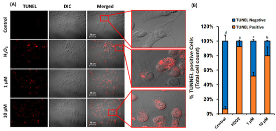 β-cryptoxanthin mediated HeLa cell nuclear DNA fragmentation detected by the TUNEL assay. (A) HeLa cells treated with β-cryptoxanthin (1.0 and 10 μM) for 24 h. The treatments with H2O2 were used as a positive control to induce nuclear DNA fragmentation. Scale bar, 50 μm. (B) The percentage of TUNEL positive and negative cell counts. The TUNEL-positive cells were quantified by manual counting of at least 300 cells. All data are reported as mean values ± SD from independent experiments (n = 3). The means accompanied by different alphabets (e.g., a, b, c, and d) are significantly different at p < 0.05. Scale bar, 50 μm.