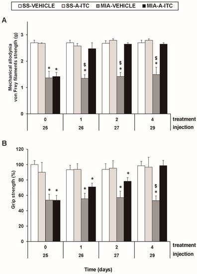Treatment with allyl isothiocyanate (A-ITC) reduces the mechanical allodynia and the grip strength deficits induced by the intra-articular injection of MIA. The development of (A) mechanical allodynia in the ipsilateral paw and (B) grip strength deficits in the hind paws of the MIA- or SS-injected mice treated with A-ITC or vehicle for 4 consecutive days are shown. The effects of A-ITC were evaluated at days 26, 27, and 29 after MIA or SS injection. For each test and time evaluated, * denotes significant differences vs. their respective SS-injected mice, and $ denotes significant differences vs. MIA-injected mice treated with A-ITC (p < 0.05; one-way ANOVA followed by the Student–Newman–Keuls test). The results are shown as the mean values ± SEM; n = 6 animals per experimental group.