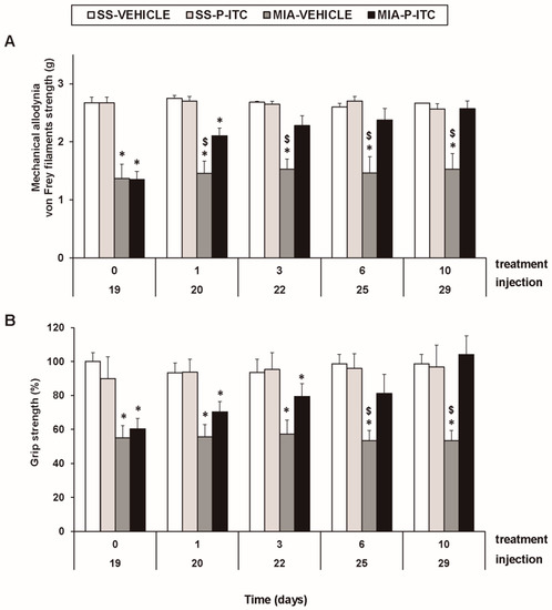 Treatment with phenyl isothiocyanate (P-ITC) decreases the mechanical allodynia and the grip strength deficits induced by the intra-articular injection of MIA. The development of (A) the mechanical allodynia in the ipsilateral paw and (B) the grip strength deficits in the hind paws of the MIA- or SS-injected mice treated with P-ITC or vehicle for 10 consecutive days are presented. The effects of P-ITC were assessed at days 20, 22, 25, and 29 after MIA or SS injection. For each test and time evaluated, * denotes significant differences vs. their respective SS-injected mice, and $ denotes significant differences vs. MIA-injected mice treated with P-ITC (p < 0.05; one-way ANOVA followed by the Student–Newman–Keuls test). The results are shown as the mean values ± SEM; n = 6 animals per experimental group.