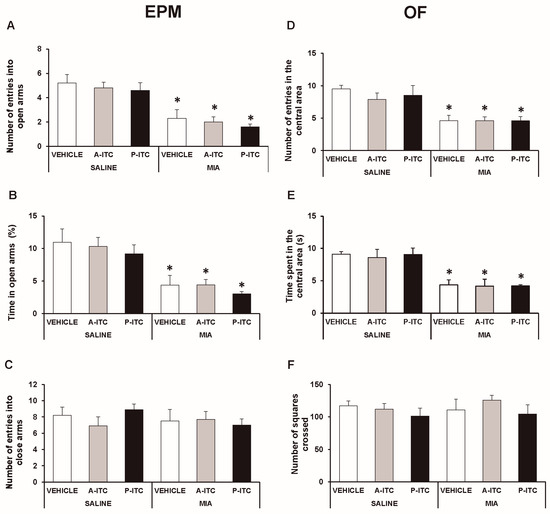 In the OF test, the two-way ANOVA also revealed significant effects of the injection in the number of entries in the central area (F1,54 = 35.69, p < 0.001) and in the time spent in it (F1,54 = 36.30, p < 0.001). The significant reductions in the number of entries into the central area (F5,54 = 7.69, p < 0.001, ANOVA versus SS-injected mice treated with vehicle; Figure 3D) and in the time spent in it (F5,54 = 7.30, p < 0.001, ANOVA versus SS-injected mice treated with vehicle; Figure 3E) caused by MIA were not reversed by the repeated administration of A-ITC or P-ITC. Thus, confirming that both treatments are not capable of normalizing the anxiety-like responses induced by MIA. Finally, no differences in the number of squares crossed in the OF test were detected between MIA and SS-injected mice treated with A-ITC, P-ITC, or vehicle (Figure 3F).