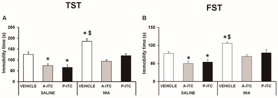 Treatment with A-ITC or P-ITC decreases the depressive-like behaviors associated with chronic osteoarthritis pain. The immobility time (s) evaluated with the (A) tail suspension test (TST) and (B) forced swimming test (FST) at 29 days after MIA or SS injection in mice treated for 4 consecutive days with A-ITC or for 10 days with P-ITC is shown. For each test evaluated, * denotes significant differences vs. SS-injected mice treated with vehicle, and $ denotes significant differences vs. MIA-injected mice treated with a drug (p < 0.05; one-way ANOVA followed by the Student–Newman–Keuls test). The results are presented as the mean values ± SEM; n = 10 animals per experimental group.