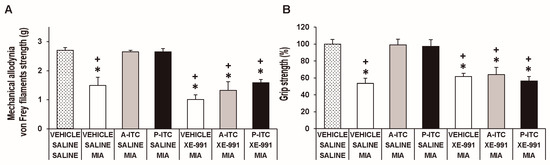 The administration of XE-991 reverses the inhibition of the mechanical allodynia and grip strength deficits of A-ITC and P-ITC during chronic osteoarthritis pain. The mechanical allodynia in the ipsilateral paw (A) and grip strength deficits in the hind paws (B) of the MIA-injected mice treated with A-ITC or P-ITC during 4 or 10 days alone and combined with the selective Kv7 potassium channel blocker XE-991 are shown. The effects of XE-991 administered alone are also represented. For each test evaluated, * denotes significant differences vs. saline-saline-injected mice treated with vehicle and + denotes significant differences vs. MIA saline-injected mice treated with a drug (p < 0.05; one-way ANOVA followed by the Student–Newman–Keuls test). The results are shown as the mean values ± SEM; n = 6 animals per experimental group.