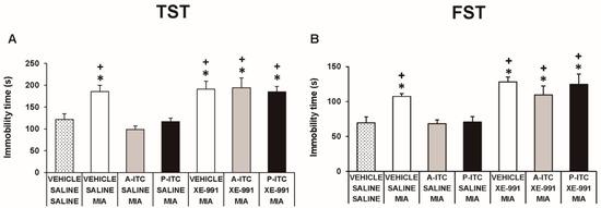The administration of XE-991 reverses the antidepressant effects of A-ITC and P-ITC in mice with chronic osteoarthritis pain. The immobility time (s) evaluated with the (A) TST and (B) FST in mice treated for 4 or 10 consecutive days with A-ITC or P-ITC alone and combined with the selective Kv7 potassium channel blocker XE-991 is shown. The effects of XE-991 administered alone are also represented. For each test evaluated, * denotes significant differences vs. saline–saline-injected mice treated with vehicle and + denotes significant differences vs. MIA–saline-injected mice treated with a drug (p < 0.05; one-way ANOVA followed by the Student–Newman–Keuls test). The results are shown as the mean values ± SEM; n = 6–8 animals per experimental group.