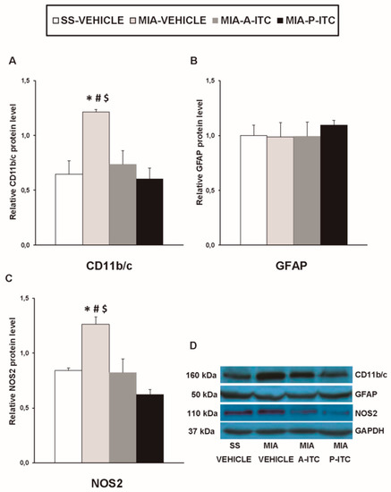 A-ITC and P-ITC treatments inhibit the overexpression of CD11b/c and NOS2 in the hippocampus of mice with osteoarthritis pain. The relative protein levels of (A) CD11b/c, (B) GFAP, and (C) NOS2 in the hippocampus of MIA-injected mice treated with A-ITC, P-ITC, or vehicle are presented. The SS-injected mice treated with vehicle were used as controls. (D) Representative blots for CD11b/c (160 kDa), GFAP (50 kDa), NOS2 (110 kDa), and GAPDH (37 kDa). All proteins are expressed relative to GAPDH levels. In all panels, * denotes significant differences vs. SS-injected mice treated with vehicle, # vs. MIA-injected mice treated with A-ITC and $ vs. MIA-injected mice treated with P-ITC (p < 0.05; one-way ANOVA followed by the Student–Newman–Keuls test). The results are presented as the mean ± SEM; n = 4 samples per experimental group.