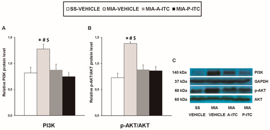 A-ITC and P-ITC treatments inhibit the overexpression of phosphatidylinositol 3-kinase (PI3K) and protein kinase B (p-Akt) in the hippocampus of mice with osteoarthritis pain. The relative protein levels of (A) PI3K and (B) p-Akt/Akt in the hippocampus of MIA-injected mice treated with A-ITC, P-ITC, or vehicle are presented. The SS-injected mice treated with vehicle were used as controls. (C) Representative blots for PI3K (140 kDa), glyceraldehyde-3-phosphate dehydrogenase (GAPDH) (37 kDa), p-Akt (60 kDa), and Akt (60 kDa). PI3K is expressed relative to GAPDH levels and p-Akt relative to total Akt. In all panels, * denotes significant differences vs. SS-injected mice treated with vehicle, # vs. MIA-injected mice treated with A-ITC and $ vs. MIA-injected mice treated with P-ITC (p < 0.05; one-way ANOVA and Student–Newman–Keuls test). Results are presented as the mean ± SEM; n = 4 samples per experimental group.