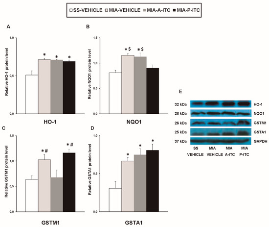 A-ITC and/or P-ITC treatments maintain the overexpression of heme oxygenase 1 (HO-1), quinone oxidoreductase-1 (NQO1), glutathione S-transferase mu 1 (GSTM1), and/or glutathione S-transferase alpha 1 (GSTA1) in the hippocampus of mice with osteoarthritis pain. The relative protein levels of (A) HO-1, (B) NQO1, (C) GSTM1, and (D) GSTA1 in the hippocampus of MIA-injected mice treated with A-ITC, P-ITC, or vehicle are presented. The SS-injected mice treated with vehicle were used as controls. (E) Representative blots for HO-1 (32 kDa), NQO1 (28 kDa), GSTM1 (26 kDa), GSTA1 (25 kDa), and GAPDH (37 kDa). All proteins are expressed relative to GAPDH levels. In all panels, * denotes significant differences vs. SS-injected mice treated with vehicle, # vs. MIA-injected mice treated with A-ITC and $ vs. MIA-injected mice treated with P-ITC (p < 0.05; one-way ANOVA and Student–Newman–Keuls test). The results are presented as the mean ± SEM; n = 4 samples per experimental group.