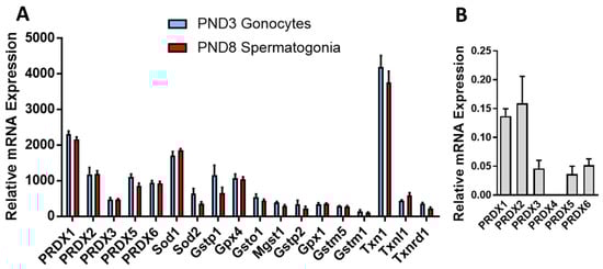 Relative expression of antioxidant genes in postnatal day 3 (PND3) gonocytes and PND8 spermatogonia. (A) gene array analysis of PND3 gonocytes and PND8 spermatogonia antioxidant genes. (B) qPCR analysis of PRDXs expression in PND3 gonocytes. Results represent the means ± SEM from 3 or 4 experiments, each using multiples animals.