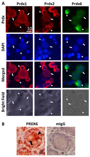 For ICC, the protein expression of PRDX1, 2, and 6 were examined in low purity gonocyte fractions pooled, washed with PBS, and fixed with 3.5% paraformaldehyde right after the BSA gradient. The fixed cells were collected by cytospin centrifugation, the slides dried and treated with acetone:methanol (60:40), followed by the antigen retrieval solution. The ICC reactions were similar to those described above for IHC, except for the use of fluorescent secondary antibodies. DAPI was used as a nuclear signal. Rabbit and mouse IgG were used as negative controls and gave no fluorescent signal (data not shown). Pictures of fluorescent signals and bright field were taken, using the same time of exposure for the specific antibodies and non-specific IgGs. Representative samples are shown.