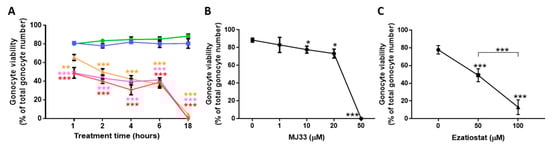 Effects of PRDX inhibitors on PND3 gonocyte viability. Cell viability was determined by trypan blue exclusion method. (A) Dose response and time course of conoidin A effects. Control: green; Conoidin A at 0.1 μM (blue); 1 μM (orange); 5 μM (pink); 10 μM (red). (B) MJ33 dose response at 18 h treatments. (C) Ezatiostat dose response at two hours of treatment. Results represent the means ± SEM from at least three experiments. Statistical significance: * p ≤ 0.05; ** p ≤ 0.01; *** p ≤ 0.001.