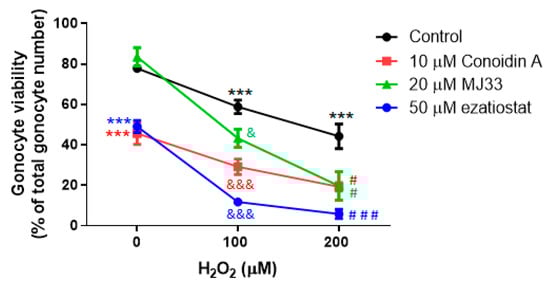 Effects of H2O2 and PRDX inhibitors on PND3 gonocyte viability. H2O2 and PRDX inhibitors were added to the cells at the indicated concentrations, alone or together for 2 h. Cell viability was determined by trypan blue exclusion method. Results represent the means ± SEM from at least three experiments. Statistical significance: *** p ≤ 0.001 treatment vs control; & p ≤ 0.05, &&& p ≤ 0.001 treatment vs 100 μM H2O2; # p ≤ 0.05, ### p ≤ 0.001 treatment vs 200 μM H2O2.