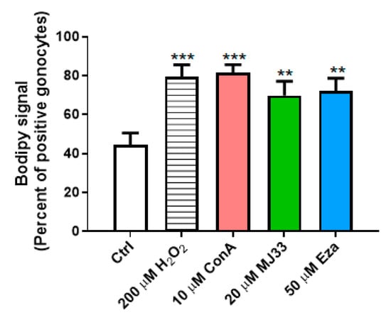 Lipid peroxidation has been known for decades to be one of the sources of spermatozoa damage in infertile men []. Thus, we examined whether lipid peroxidation could also play a role in the deleterious effects of H2O2 and PRDX inhibitors on gonocyte viability, using a fluorescent fatty acid reporter system that allowed quantifying the proportion of cells where lipid peroxidation had occurred. While lipid peroxidation was detectable in 40% of the control gonocytes, a condition corresponding to 80% cell viability, treatment with H2O2 (a condition decreasing cell viability by 50%) doubled the numbers of gonocytes presenting lipid peroxidation to nearly 80% of positive cells in gonocytes (Figure 5). To examine the effects of PRDX inhibitors, we used concentrations of conoidin A and ezatiostat decreasing viability by ~50% (10 and 50 μM respectively), and a concentration of MJ33 that did not significantly alter cell viability compared to controls (20 μM). Treatments with conoidin A alone had the same effect as H2O2 on lipid peroxidation, doubling the percent of gonocytes presenting lipid peroxidation, while MJ33 and ezatiostat induced significant but lower increases in lipid peroxidation, reaching 70% of positive cells, a 1.55 increase over the levels in control cells (Figure 5).