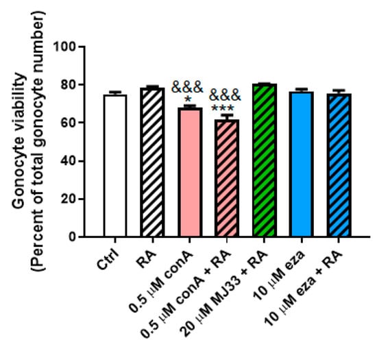 Considering the physiological roles played by ROS in many tissues and cell types, including in spermatozoa, and our finding that inhibiting PRDXs increases endogenous ROS formation in PND3 gonocytes, we examined whether blocking PRDXs could affect RA-induced gonocytes differentiation. First, we determined cell viability in cells treated for two hours with RA alone or together with two different concentrations of PRDX inhibitors, in order to select concentrations of inhibitors that would not overly decrease cell survival. RA at 1 μM did not have an effect on cell survival. Similarly, concentrations of 20 μM MJ33 or 10 μM ezatiostat did not affect cell viability (Figure 6). While 0.5 μM conoidin A decreased cell viability by 9% when used alone, and 17% when added with RA in comparison to control and RA treatments, these was still relatively minor effects.