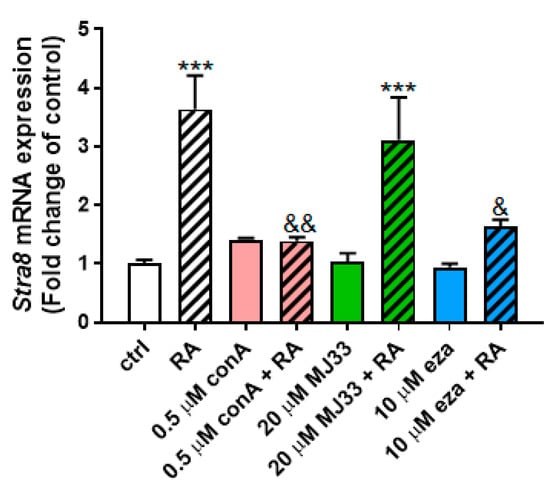 Next, we measured the mRNA expression of Stra8, previously found to be a good marker for assessing neonatal gonocyte differentiation [,,]. While two hours of treatment with RA significantly increased Stra8 expression by over three-fold, there was no effect of conoidin A, MJ33 or ezatiostat added alone to the cells (Figure 7). However, both conoidin A and ezatiostat significantly repressed RA-induced Stra8 increases, indicating inhibitory effects of PRDX inhibitors on gonocytes differentiation. However, MJ33 did not alter RA effect on Stra8 levels. These data suggest that the oxidative stress resulting from PRDXs inhibition is detrimental to gonocytes differentiation, whereas PRDX6 iPLA activity does not appear to be required for gonocyte differentiation.