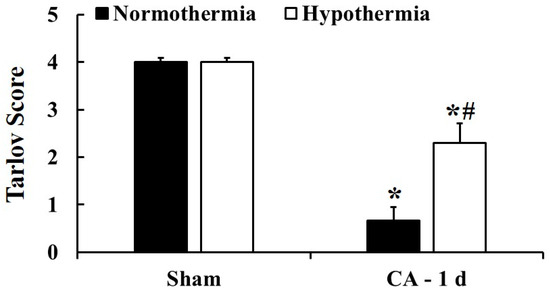 Neurological evaluation for hind limb motor function in the sham/normothermia, sham/hypothermia, ACA/normothermia, and ACA/hypothermia groups at 1 day after ACA. The ACA/hypothermia group shows a milder neurological deficit than the ACA/normothermia group. A high score represents good motor function. The bars indicate the means ± SEM (n = 5, 7, and 7 for the sham, ACA/normothermia, and ACA/hypothermia group, respectively; * p < 0.05 vs. each sham group; # p < 0.05 vs. the ACA/normothermia group).