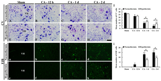 In the ACA/hypothermia groups, the distribution pattern of CV-positive cells observed at 12 h after ACA was similar to that in the sham/hypothermia group (Figure 3F), and no FJB-positive cells were found (Figure 3f). At 1 and 2 days after ACA, the number of CV-positive cells were higher (Figure 3I), whereas the number of FJB-positive cells were lower (Figure 3i) than those in the ACA/normothermia groups, showing that many of the CV- and FJB-positive cells were much less damaged than the ACA/normothermia groups (Figure 3G,H,g,h).