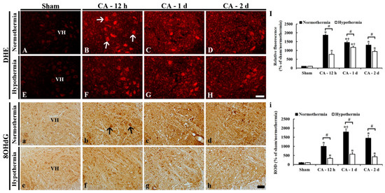 In the ACA/normothermia group, 8OHdG immunoreactivity was strong: 8OHdG immunoreactivity was significantly increased about 900% at 12 h, 1690% at 1 day, and 1350% at 2 days after ACA when compared to that in ACA/sham group (Figure 5b–d,i).
