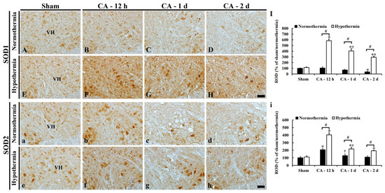 In the ACA/normothermia group, SOD2 immunoreactivity at 12 h after ACA was significantly increased about 110% compared to that in the sham/normothermia group (Figure 6b,i). Thereafter, the increased SOD2 immunoreactivity was steadily reduced until 2 days after ACA (Figure 6c,d), showing that SOD2 immunoreactivity at 2 days after ACA was similar to that of the sham/normothermia group (Figure 6i).