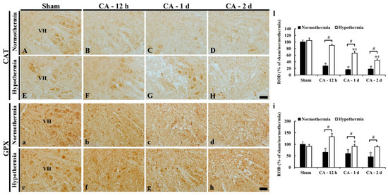 In the ACA/hypothermia group, CAT immunoreactivity at 12 h after ACA was significantly higher (about 60% of the ACA/normothermia group) compared to that in the ACA/normothermia group (Figure 7F,I); thereafter, CAT immunoreactivity was gradually decreased, showing that CAT immunoreactivity at 2 days after ACA was about 30% of the ACA/normothermia group (Figure 7G–I).
