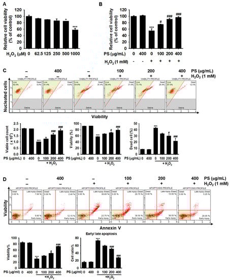 Viable cell count, viability, and dead cell populations were measured by flow cytometry. Briefly, HaCaT keratinocytes were seeded at a density of 1 × 104 cells/mL overnight and treated with the indicated concentrations of PS (0–2000 μg/mL) for 20 h followed by exposure with 1000 μM H2O2 for 4 h. Then, the harvested cells were washed with ice-cold phosphate-buffered saline (PBS) and stained with Muse® Count & Viability Kit (MCH100102, EMD Millipore; Billerica, MA, USA) for 5 min. Viable cell count, viability, and dead cell populations were measured by Muse® Cell Analyzer (EMD Millipore).