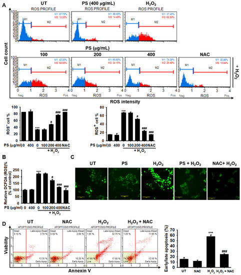PS attenuates intracellular ROS generation in H2O2-treated HaCaT keratinocytes. HaCaT keratinocytes were seeded at a density of 1 × 104 cells/mL and then stimulated with the indicated concentrations of PS (0–400 μg/mL) for 20 h prior to treatment with 1000 μM H2O2 for 4 h. N-Acetylcysein (NAC, 5 mM) was used as the negative control. (A) Intracellular ROS generation was measured by flow cytometry using a Muse® Oxidative Stress Kit. Mean percentages of ROS− (M1; blue) and ROS+ (M2; red) populations are shown. (B) HaCaT keratinocytes were seeded and 10 µM 2′7′-dichlorofluorescein diacetate (DCFDA) was then added to the cells. DCFDA fluorescence intensity was calculated by using a fluorometer and compared with that in the untreated group. (C) Live imaging stain using DCFDA was performed using a CELENA®S digital imaging system. (D) In a parallel experiment, HaCaT keratinocytes were pretreated with 5 mM NAC 2 h before treatment with H2O2 for 4 h. Then, the early/late apoptosis populations were measured by flow cytometry using Muse® Annexin V & Dead Cell Kit. The early/late apoptotic population is presented as a bar graph. All data are averaged from three independent experiments and presented as mean ± the standard error of the median [*** p < 0.001 vs. the untreated group (UT) and ### p < 0.001 and # p < 0.05 vs. the H2O2-treated group]. Scale bars = 100 μm.