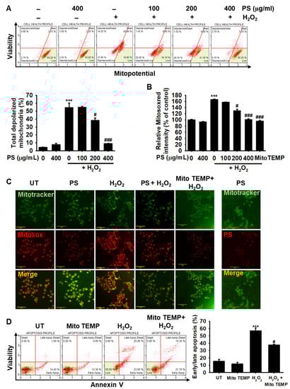 Then, we investigated the effect of PS on H2O2-induced mitochondrial depolarization and mtROS generation. Treatment with H2O2 resulted in 54.4% ± 5.9% of depolarized cells, whereas pretreatment with PS decreased the percentage to 42.1% ± 2.4% and 8.8% ± 3.5% at 200 and 400 µg/mL (Figure 5A), respectively, indicating that PS stabilized mitochondrial membrane potential and blocked its oxidative stress-mediated depolarization. However, the effect was not prominent at 100 µg/mL PS (53.8% ± 1.2%) compared with the H2O2-treated group. Consistent with the mitochondrial potential data, MitoSOX Red staining revealed that treatment with H2O2 resulted in 166.6% ± 1.3% of mtROS compared with the untreated group; however, pretreatment with PS gradually decreased the intensity to 129.7% ± 5.35% and 101.2% ± 2.8% at 200 and 400 µg/mL, respectively; moreover, the effect at 400 µg/mL PS was almost comparable to that after treatment with MitoTEMP, a specific mtROS inhibitor (Figure 5B), indicating that PS downregulated H2O2-induced mtROS generation by stabilizing the mitochondrial membrane potential. Immunofluorescence staining also revealed that treatment with H2O2 significantly increased mtROS (MitoSOX Red) generation in the mitochondria (MitoTracker); however, PS completely suppressed H2O2-mediated mtROS generation (Figure 5C). MitoTEMP also significantly inhibited mtROS generation concomitant with the downregulation of H2O2-mediated apoptosis (56.9% ± 3.8% and 37% ± 1.1%, respectively, at H2O2 and H2O2 + MitoTEMP) (Figure 5D). Altogether, these results suggested that PS downregulated H2O2-mediated apoptosis by stabilizing mitochondrial membrane potential and subsequently downregulating excessive mtROS generation.