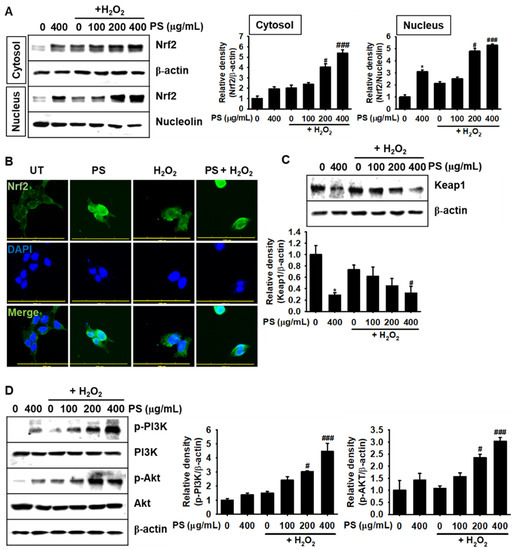 HaCaT keratinocytes were seeded at 1 × 104 cells/mL in six-well plates and treated with the indicated concentrations of PS (0–400 μg/mL) for 20 h followed by exposer with 1000 μM H2O2 for 4 h. Then, the cells were harvested and lysed with a radioimmuno precipitation assay lysis buffer (iNtRON Biotechnology; Seongnam, Korea). In a parallel experiment, the cells were washed with ice-cold PBS, and cytosolic and nuclear proteins were extracted using NE-PERTM nuclear and cytoplasmic extraction reagents (Pierce, Rockford, IL, USA). Protein was quantified by Bio-Rad protein assay reagents (Bio-Rad; Hercules, CA, USA). An equal amount of protein was separated by a SDS-polyacrylamide gel, transferred onto an PVDF membrane (Thermo Fisher Scientific), and then immunoblotted with the indicated antibodies. Bound antibodies were detected using an enhanced chemiluminescence plus kit (Thermo Fisher Scientific). The images were taken by ImageQuant LAS 500 (GE Healthcare Bio-Sciences AB; Uppsala, Sweden). The expressional value of cytosolic proteins was normalized to the intensity level of β-actin and nuclear proteins were normalized to nucleolin.