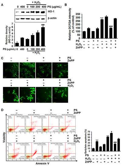 As activation and nuclear translocation of Nrf2 by Akt/PI3K stimulate the expression of HO-1, which protects cells against oxidative stress and diverse toxins [12,24], we investigated if PS upregulated the expression of HO-1. We found that treatment with PS resulted in a significant increase in HO-1 expression in a concentration-dependent manner, compared with that in the H2O2-treated group (Figure 7A). The significance of HO-1 in PS-mediated cytoprotection was elaborated using ZnPP, a well-known HO-1 inhibitor. As shown in Figure 7B, the presence of ZnPP completely abolished PS-mediated inhibition of DCFDA intensity in H2O2-induced oxidative stress and considerably elevated the intensity regardless of the existence of PS, which indicates that PS inhibits ROS generation by activating HO-1 expression. In addition, treatment with ZnPP associated with the higher fluorescence intensity than that in the PS-treated group under H2O2-stimulated conditions (Figure 7C). Significance of HO-1 in H2O2-induced apoptosis were also confirmed in HaCaT keratinocytes. As shown in Figure 7D, treatment with ZnPP significantly increased apoptotic population (35.2% ± 2.2%) compared with that in the untreated group (9.9% ± 1.6%) and in H2O2-treated conditions (51.9% ± 0.7%), ZnPP further increased the populations (64.9% ± 1.2%). PS downregulated the percentage of ZnPP- and H2O2-mediated apoptosis to 24.6% ± 1.3% and 26.5% ± 1.6%, respectively; however, PS slightly downregulated H2O2-mediated apoptosis in the presence of ZnPP (44.7% ± 2.7%), indicating that HO-1 acted as the key detoxifying enzyme against H2O2-induced oxidative stress conditions. Altogether, these data suggested that PS exerts its cytoprotective effect by stimulating the canonical Nrf2/HO-1 axis.
