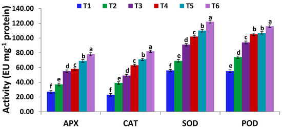 Ascorbate peroxidase (APX), catalase (CAT), superoxide dismutase (SOD), and peroxidase (POD) activities in leaves of un-inoculated and inoculated soybean plants with Serratia marcescens BM1 under Cd stress. Data are means ± SE (n = 4). Different letters (a–f) above the chart columns indicate significant differences between treatments (p ≤ 0.05). T1, control with no Cd and BM1 treatment; T2, plant treated with Serratia marcescens BM1; T3, plant treated with 150 µM CdCl2; T4, plant treated with 150 µM CdCl2 and Serratia marcescens BM1; T5, plant treated with 300 µM CdCl2; T6, plant treated with 300 µM CdCl2 and Serratia marcescens BM1.