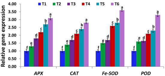 Expression levels of APX, CAT, Fe-SOD, and POD genes in leaves of un-inoculated and inoculated soybean plants with Serratia marcescens BM1 under Cd stress. Data are means ± SE (n = 4). Different letters (a–f) above the chart columns indicate significant differences between treatments (p ≤ 0.05). T1, control with no Cd and BM1 treatment; T2, plant treated with Serratia marcescens BM1; T3, plant treated with 150 µM CdCl2; T4, plant treated with 150 µM CdCl2 and Serratia marcescens BM1; T5, plant treated with 300 µM CdCl2; T6, plant treated with 300 µM CdCl2 and Serratia marcescens BM1.